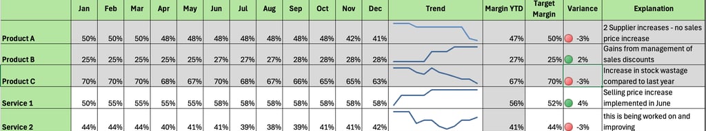 A simpler way to keep a handle on this each month is to view the margin trends of products / product groups or services on a single page . Quickly able to spot each month, which product needs addressing and adjusting.